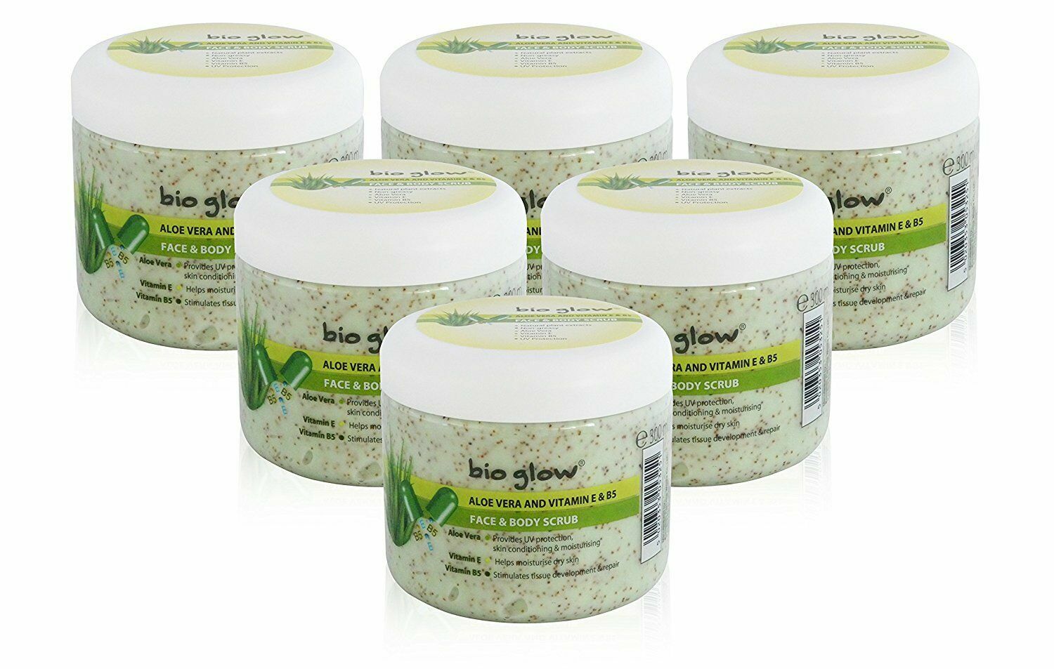 Bio Glow ALOE VERA Face Body Scrub Vitamin E and B5 UV Protection 300ml by Bioglow. A powerful face scrub that helps improve the texture of your skin. Bio Glow ALOE VERA Face Body Scrub Vitamin E and B5 UV Protection 300ml by Bioglow. Its able to exfoliate intensely effectively removing dead skin cells without harming the skin while clearing blackheads cleansing and refining the pores. Attractive tub packaging. Aloe Vera improves hydration helps to accelerate skin tissue repair and encourages normal cell growth. Formulated with Provitamin B5 Aloe Vera and vitamin E this face and body scrub helps exfoliate dead skin and provide smoothing and nourishing effects to the skin. Bio Glow Aloe Vera Face Body Scrub. Provitamin B5 attracts moisture into deeper skin layers thus providing moisturising regenerating and softening effects.