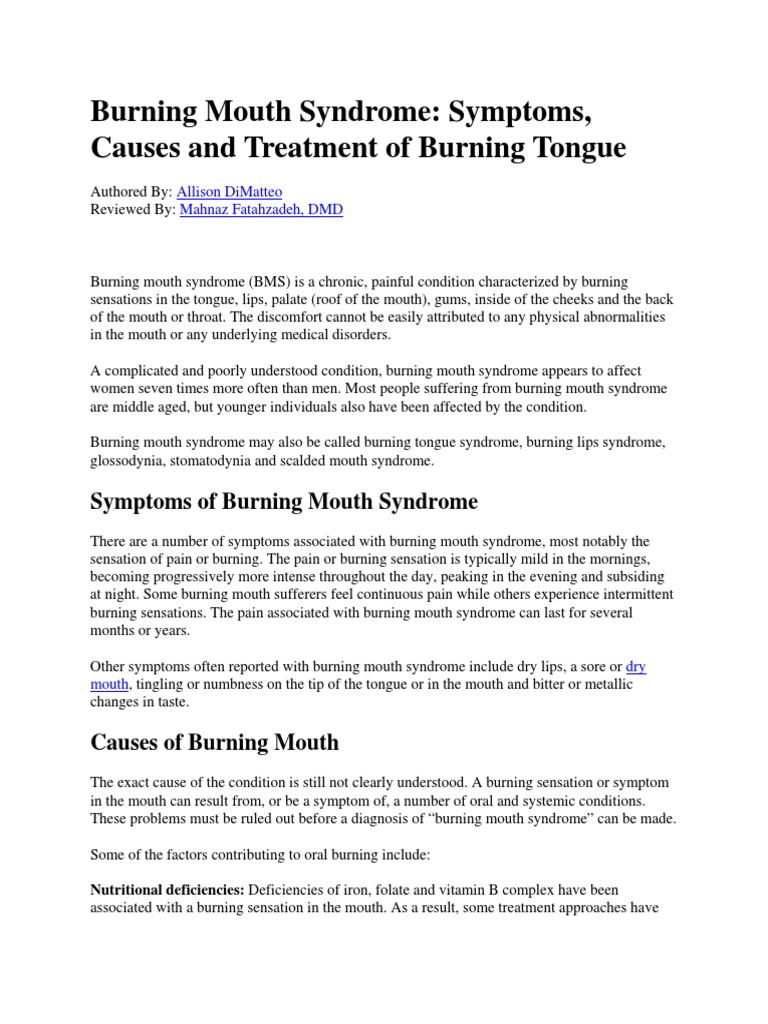As mentioned above one of the potential underlying causes of burning mouth syndrome is a deficiency in. A deficiency of this essential nutrient can cause problems with the nerves including burning mouth or tongue.
